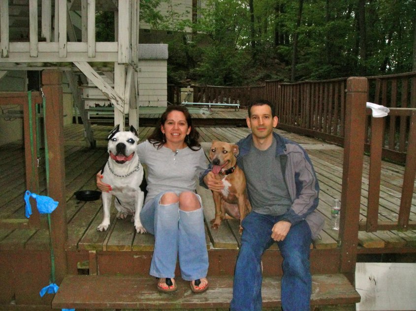 Our next foster dog would be a huge challenge. Major was a two year old 75 pound pit bull. Unlike Booker, Major was a dominant dog and much more athletic. At AHS-Newark, his striking good looks captivated us. At the same time, we knew large pit bulls fared poorly at this shelter. Outside the shelter, Daphne confirmed our suspicions that these two were going to be a handful. When Daphne and Major met, Daphne nipped Major on the head after he got in her face. As we did with Booker, Estrella and I walked Daphne and Major together for long time moving progressively closer together. Finally, we got the dogs together, but this time it was more like a truce than true love.