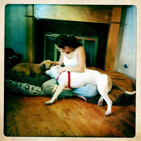 We selected Booker as our foster. Booker was an 85 pound older American bulldog with a sad story. At the shelter, he appeared unhappy and was not in great physical shape. Also, we were told he was used as a guard dog (he was not aggressive at all) by a landlord in abandoned apartments (the separation anxiety we would learn about seemed to confirm this). We were certain he had zero chance to make it out alive. For Daphne, we thought he’d be a perfect fit. Not dominant enough to challenge her, but big enough survive an attack by our supposedly dog aggressive pit bull.
