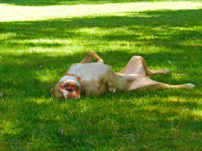On the day we picked Booker up from the shelter, we had a plan to introduce the dogs. We took them to Saddle Brook County Park and started walking them far apart. Over a period of time, we gradually walked them closer together. They seemed happy! Would this continue? When we came to our tiny yard at our townhouse, we placed both leashes down. Daphne and Booker wrestled and then Daphne rolled around on her back beneath Booker. This was going to work!