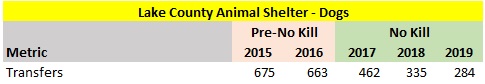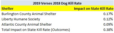 New Jersey animal shelters rescue far more dogs from out of state than from other New Jersey animal shelters. Specifically, New Jersey animal shelters transferred in 8,197 dogs from out of state animal shelters and only rescued 2,308 dogs from other New Jersey animal shelters. However, St. Hubert’s frequently transfers a substantial number of its transports quickly to its partners in New Jersey and other states. If I back out St. Hubert’s transfers of dogs to out of state organizations, the number of transports decreases from 8,197 dogs to 5,269 dogs. While the state’s local kill rate decreased in 2019, it is likely the local kill rate would have decreased by more if not for the massive number of out of state transports.