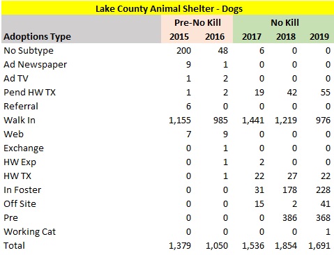 LCAS 2015 to 2019 Dog Adoptions Subtypes