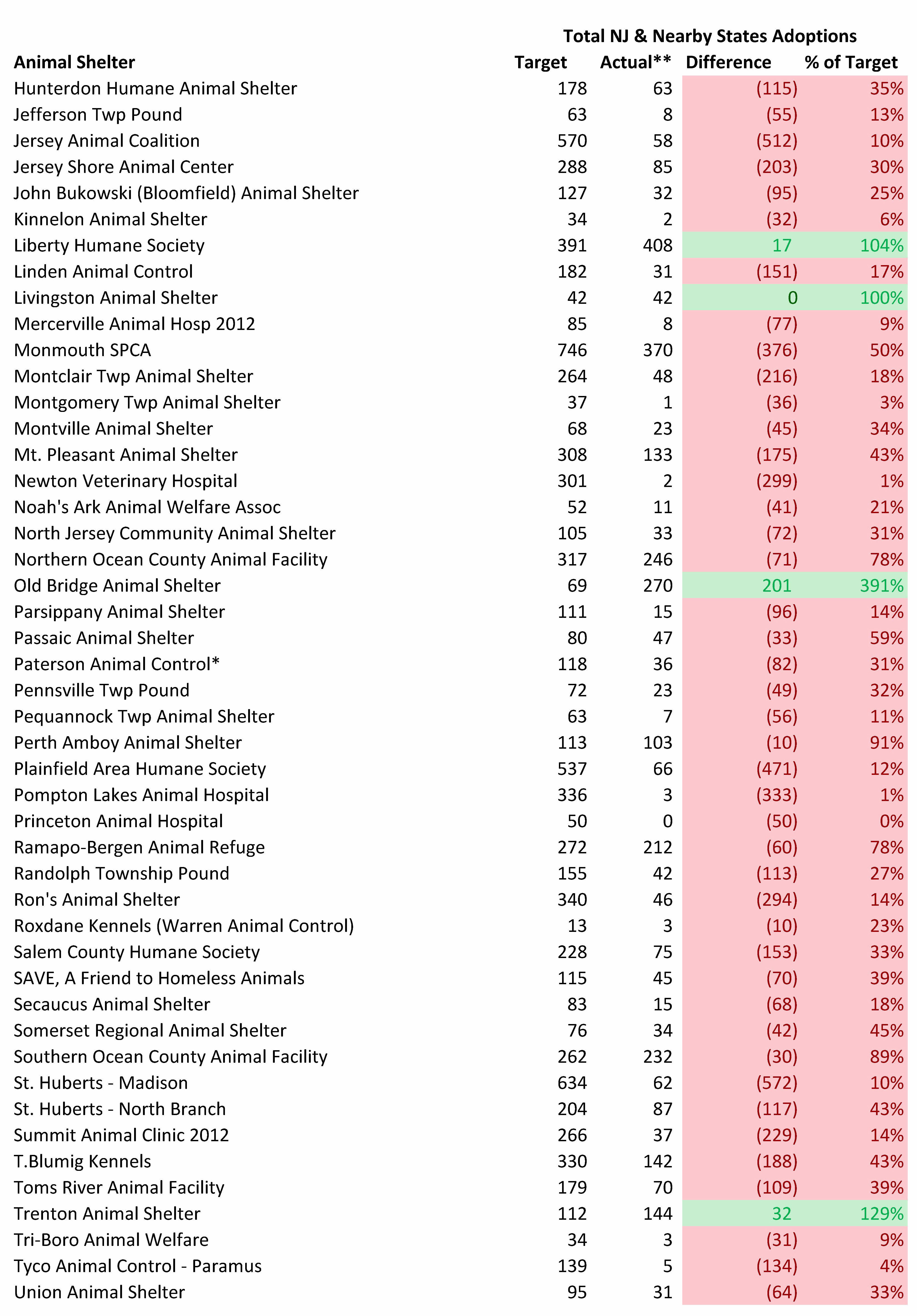 - Bergen County Animal Shelter – 428 fewer dogs adopted than targeted