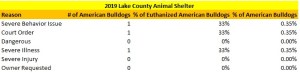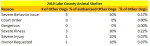 Lake County Animal Shelter limits behavioral euthanasia to truly aggressive dogs. As you can see in the following table listing the reasons Lake County Animal Shelter used to euthanize dogs in 2019, the shelter only euthanized 0.40% of all dogs for behavioral related reasons (i.e. severe behavior issue, court order and dangerous). Remarkably, Lake County Animal Shelter meets the No Kill Advocacy Center behavioral euthanasia target (i.e. under 1%) that even many no kill shelters claim is too lofty. Thus, Lake County Animal Shelter limited behavioral euthanasia to truly aggressive dogs.