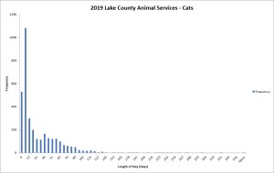 Substantially all Lake County Animal Shelter cats left the facility quickly. The following table shows the distribution of the cat lengths of stay. 57% and 70% of cats left the shelter within 13 days and 32 days. In fact, 96% of all cats left the shelter within 89 days. As with dogs, a small number of cats did stay substantially longer, but this is normal at a high performing no kill shelter that strives to save virtually every animal. Thus, Lake County Animal Shelter achieved no kill by quickly finding live outcomes for substantially all of its cats.