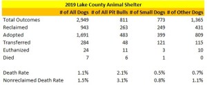 To better reflect Lake County Animal Shelter’s pit bull statistics, I included American bulldogs in the pit bull data. Typically, I only include traditional “pit bull” like breeds, such as American pit bull terriers, American Staffordshire terriers, Staffordshire bull terriers and bull terriers. In the shelters I’ve reviewed, the facilities took few American bulldogs in. However, Lake County Animal Shelter impounded large numbers of American bulldogs during 2019 as the following table shows. Furthermore, the American bulldog statistics, which were excellent, were not quite as good as the traditional pit bull data. Thus, I included American bulldogs to provide a more clear picture of Lake County Animal Shelter’s pit bull performance.