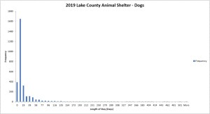 Almost all Lake County Animal Shelter dogs left the shelter quickly. The following table shows the distribution of the dog lengths of stay. Remarkably, 69% and 80% of dogs left the shelter within 10 days and 19 days. In fact, 96% of all dogs left the shelter within 96 days. Simply put, substantially all dogs left the shelter within three months or so. While a very small number of dogs did stay a lot longer, this is normal at high performing no kill shelters that strive to save rather than take lives. Thus, Lake County Animal Shelter achieved no kill by quickly placing almost all of its dogs.
