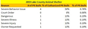The shelter also limited behavioral euthanasia for pit bull like dogs to truly aggressive animals. Lake County Animal Shelter only euthanized 1.50% of all pit bulls for aggression, behavior and court order reasons. As with all dogs, Lake County Animal Shelter only euthanized a very small number of all pit bulls for medical reasons (0.75%).