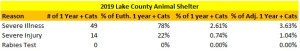 The table below lists the reasons Lake County Animal Shelter used to euthanize cats in 2019. As you can see, the shelter only euthanized cats for severe medical reasons (i.e. severe illness, severe injury and rabies test). Most impressively, Lake County Animal Shelter did not kill a single cat for behavior or aggression. Given shelters should never kill cats for aggression or behavioral reasons, this is an incredible achievement since 3,376 cats had outcomes (2,740 cats excluding the 636 Operation Caturday animals) at Lake County Animal Shelter in 2019.