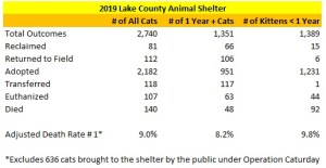 Lake County Animal Shelter also had excellent cat numbers. Overall, only 7.3% of all cats, 5.9% of 1 year old plus cats and 9.1% of kittens under 1 year old lost their lives at Lake County Animal Shelter in 2019. Even if we exclude cats who were reclaimed by owners and placed through the return to field program, only 9.7% of all cats, 9.4% of 1 year old plus cats and 9.9% of kittens under 1 year old lost their lives in 2019. Thus, Lake County Animal Shelter saved almost all their cats of various ages.