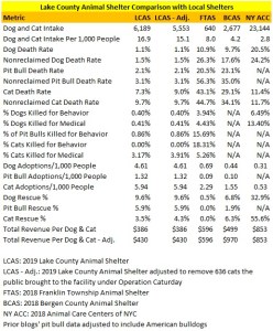 The New York and New Jersey animal shelters also received far more funding per animal than Lake County Animal Shelter. NY ACC, Bergen County Animal Shelter, Franklin Township Animal Shelter and Ocean County Animal Facility received 2.2 times, 1.3 times, 1.5 times and 3.3 times the funding per dog and cat. When we exclude Lake County Animal Shelter’s 636 cats brought into Lake County Animal Shelter by the public under Operation Caturday and the many cats going through Bergen County Animal Shelter’s TNR program, NY ACC, Bergen County Animal Shelter, Franklin Township Animal Shelter and Ocean County Animal Facility received 2.0 times, 2.3 times, 1.4 times and 2.9 times the funding per animal. Furthermore, Lake County Animal Shelter impounded a much greater percentage of dogs which cost much more to care for. Dogs made up 47% of Lake County Animal Shelter’s intake compared to 36% at NY ACC, 14% at Bergen County Animal Shelter, 32% at Franklin Township Animal Shelter and 32% at Ocean County Animal Facility. When we exclude the cats brought in by the public to Lake County Animal Shelter under Operation Caturday and the many cats going through Bergen County Animal Shelter’s TNR program, dogs made up 53% of intake at Lake County Animal Shelter and 27% at Bergen County Animal Shelter. Thus, Lake County Animal Shelter was massively underfunded compared to the New York and New Jersey animal shelters.