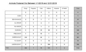 Lake County Animal Shelter sent 349 dogs, 79 cats and 721 kittens to foster homes in 2019. Overall, 12% of all impounded dogs went to a foster home after arriving at Lake County Animal Shelter. Similarly, the shelter sent 25% of all cats and 31% of all cats excluding cats brought to the shelter by the public under Operation Caturday to foster homes. In particular, the shelter sent 48% of all kittens to foster homes. Thus, Lake County Animal Shelter sent large numbers of dogs and cats to foster homes in 2019.