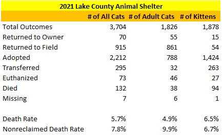 Lake County Animal Shelter also had excellent cat numbers. Overall, only 5.7% of all cats, 4.9% of adult cats and 6.5% of kittens lost their lives at Lake County Animal Shelter in 2021. Even if we exclude cats who were reclaimed by owners and placed through the return to field program, only 7.8% of all cats, 9.9% of adult cats and 6.7% of kittens their lives in 2021. Thus, Lake County Animal Shelter saved almost all their cats of various ages.