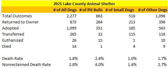 Lake County Animal Shelter saved virtually every dog that arrived in 2021. Overall, only 1.8% of all dogs, 2.4% of pit bull like dogs, 1.0% of small dogs and 1.7% of other medium to large size dogs lost their lives at the shelter. In other words, Lake County Animal Shelter saved approximately 98% of all dogs, 98% of pit bull like dogs, 99% of small dogs and 98% of other medium to large size dogs. Even if we only look at dogs who were not reclaimed by owners, only 2.8% of all dogs, 4.0% of pit bulls, 1.6% of small dogs and 1.7% of other medium to large size breeds lost their lives in 2021. Thus, Lake County Animal Shelter saved almost every dog it took in last year.
