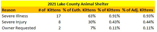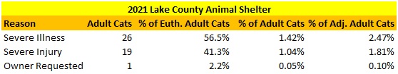 The table below lists the reasons Lake County Animal Shelter used to euthanize cats in 2021. As you can see, the shelter only euthanized cats for severe medical reasons (i.e. severe illness and severe injury ). Most impressively, Lake County Animal Shelter did not kill a single cat for behavior or aggression. Given shelters should never kill cats for aggression or behavioral reasons, this is an incredible achievement since 3,704 cats had outcomes (2,875 cats excluding the 829 Operation Caturday animals) at Lake County Animal Shelter in 2021.