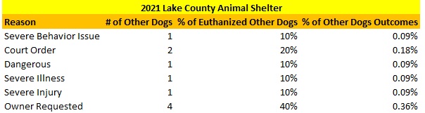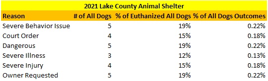 Lake County Animal Shelter limits behavioral euthanasia to truly aggressive dogs. As you can see in the following table listing the reasons Lake County Animal Shelter used to euthanize dogs in 2021, the shelter only euthanized 0.62% of all dogs for behavioral related reasons (i.e. severe behavior issue, court order and dangerous). Remarkably, Lake County Animal Shelter meets the No Kill Advocacy Center behavioral euthanasia target (i.e. under 1%) that even many no kill shelters claim is too lofty. Thus, Lake County Animal Shelter limited behavioral euthanasia to truly aggressive dogs.