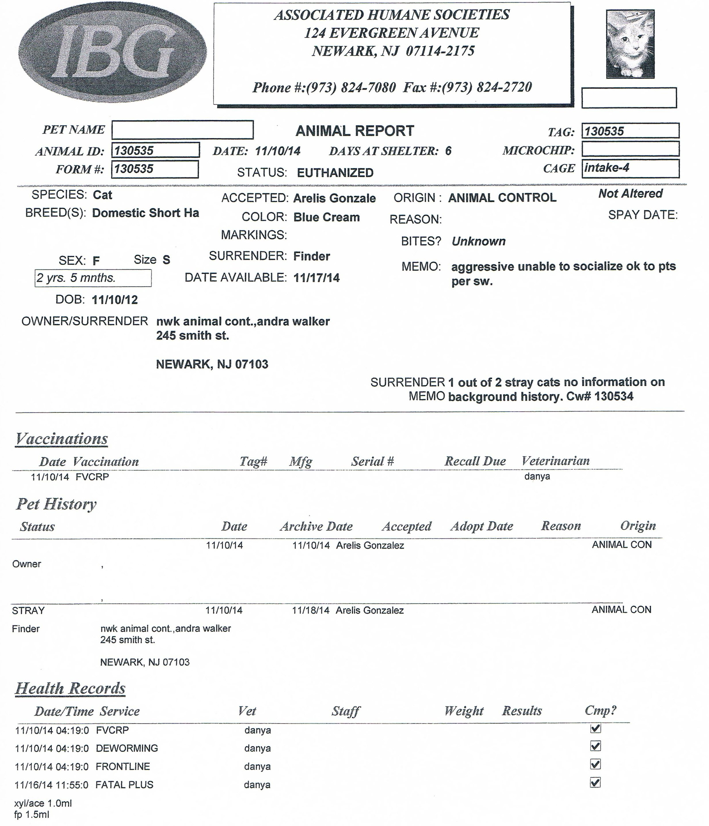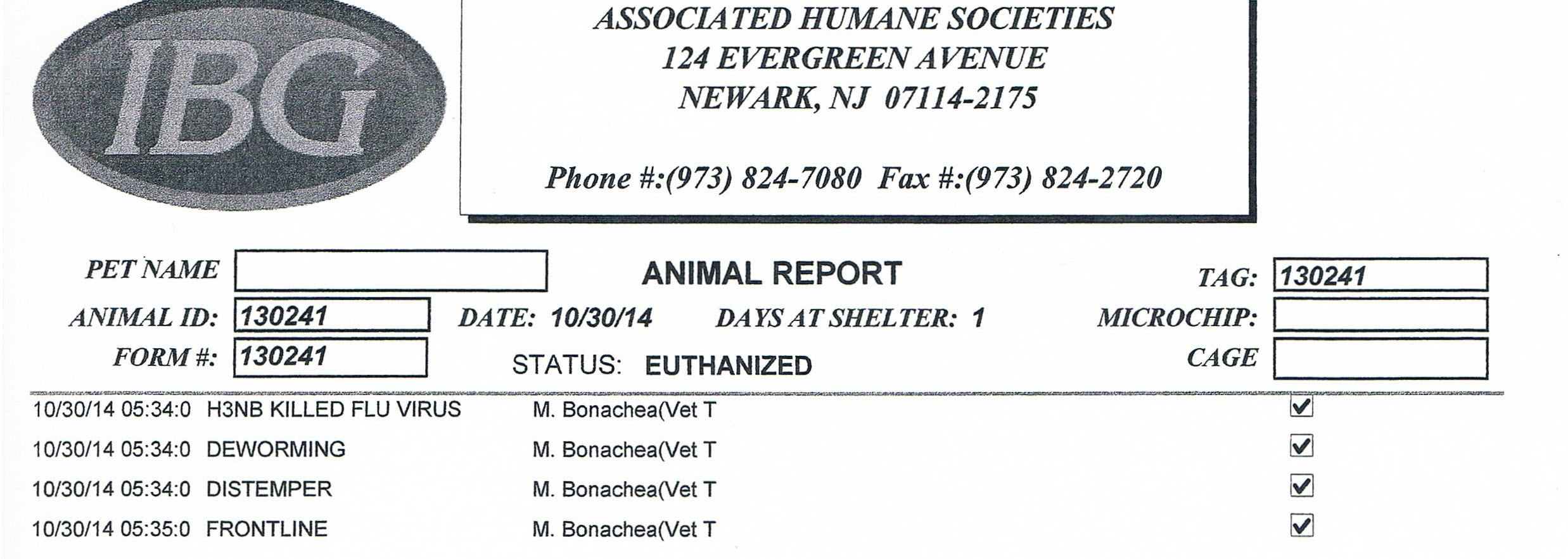 The New Jersey Department of Health found horrific problems at AHS-Newark in 2017. You can read the August 22, 2017 inspection here, the September 26, 2017 inspection here and the October 20, 2017 inspection report here. Overall, the problems were so severe that authorities charged former Executive Director, Roseann Trezza, with animal cruelty. Ultimately, the prosecutor and Roseann Trezza entered into an agreement in May 2018 to supposedly bar Ms. Trezza from the Newark shelter for two years and make her pay a $3,500 fine in exchange for dismissing the charges.