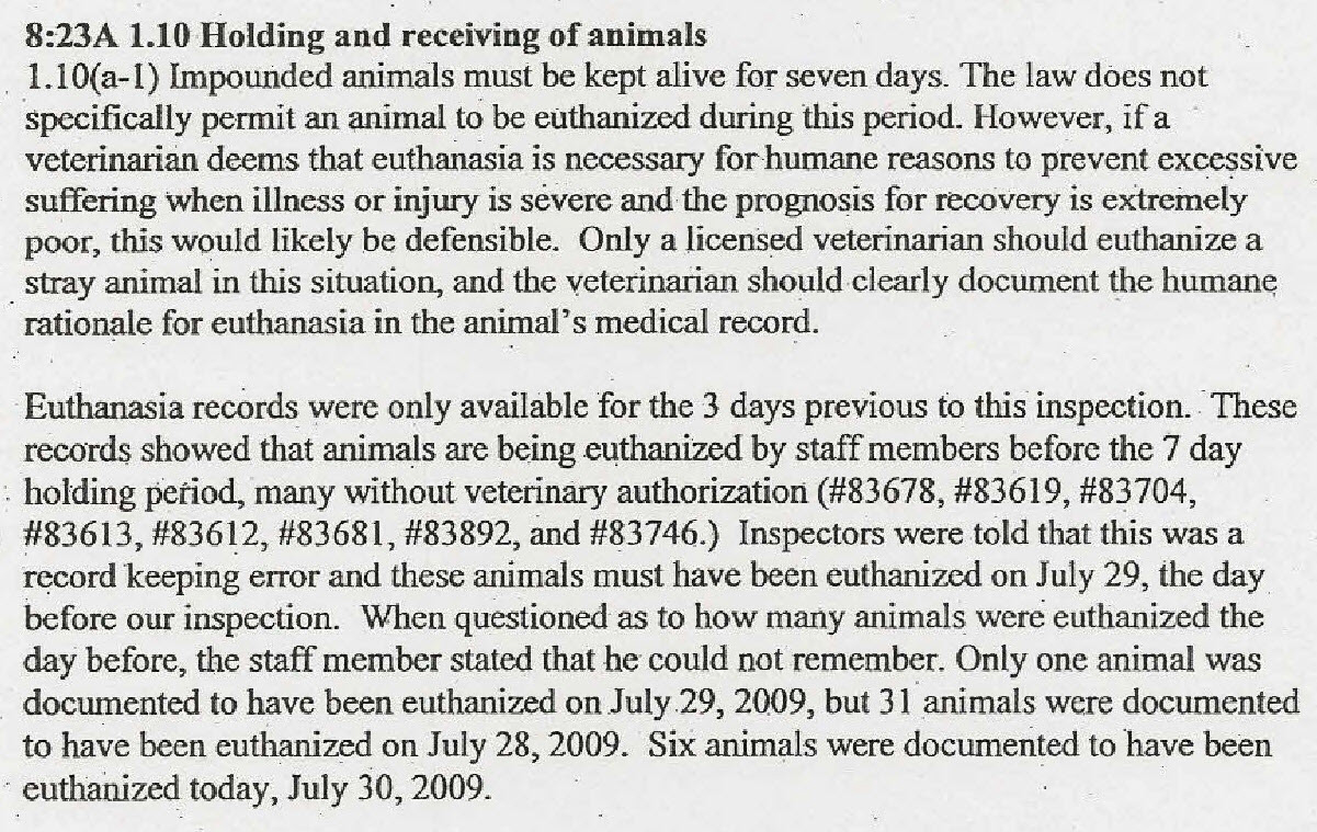 The Newark Department of Health and Community Wellness inspected AHS-Newark the very next day and found everything hunky dory. Specifically, the inspectors saw the dog and the animal had his/her wound treated with pain medicine and an antibiotic. The shelter’s records indicated the dog came in on September 11, 2010, which was a day after the September 10, 2020 date the person making the complaint stated. While the inspector did review the shelter’s intake records for September 10, 2020, I don’t think the inspector can rely on such records given AHS-Newark’s repeated inability to keep accurate records. In other words, if the dog really came in on September 10, 2020 (i.e. if AHS-Newark did not enter the animal into its records until September 11, 2020) and did not receive treatment until the next day, AHS-Newark would have violated N.J.A.C. 8.23A-1.9(d) 1 that requires prompt veterinary care to relieve pain and suffering. Thus, the Newark Department of Health and Community Wellness once again relied on AHS-Newark’s assertions instead of thoroughly inspecting the shelter.