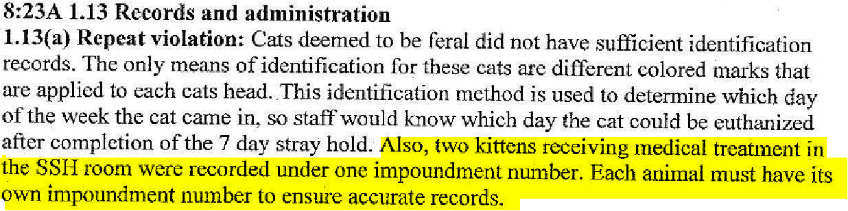 Despite the poor quality inspection, the report still found numerous violations of state animal shelter laws. The shelter admitted more kittens died the night before which could indicate violations of N.J.A.C. 8.23A-1.9 (c) that requires animals be observed daily for illness and receive prompt treatment. AHS-Newark also didn’t know the amount of water and disinfectant used in its solutions to clean cages. Obviously, the correct ratio of water to disinfectant in these solutions is critical to ensure proper disinfection and safety for the animals (i.e. avoid chemical burns, breathing in chemicals, etc.). Clearly, the shelter violated N.J.A.C. 8.23A-1.8 (c) that states shelters must clean with “all soiled surfaces with a detergent solution followed by a safe and effective disinfectant.” The shelter also violated N.J.A.C. 8.23A-1.6 and N.J.A.C. 8.23A-1.8 by not taking animals out of their cages during cleaning and allowing the animals to be in the enclosures while they were still wet. Also, AHS-Newark did not have hand drying paper which also violates N.J.A.C. 8.23A-1.8 (d) that states “Premises (buildings and grounds) shall be kept clean and in good repair in order to protect the animals from injury and disease, to facilitate the prescribed sanitary practices as set forth in these rules, and to prevent nuisances.” AHS-Newark also had numerous cats with no identification cards (i.e. how can the shelter know the medical history of animals and provide treatment if it can’t tell which cats are which). This violates N.J.A.C. 8.23A-1.13 which requires the shelter have accurate records of each animal.