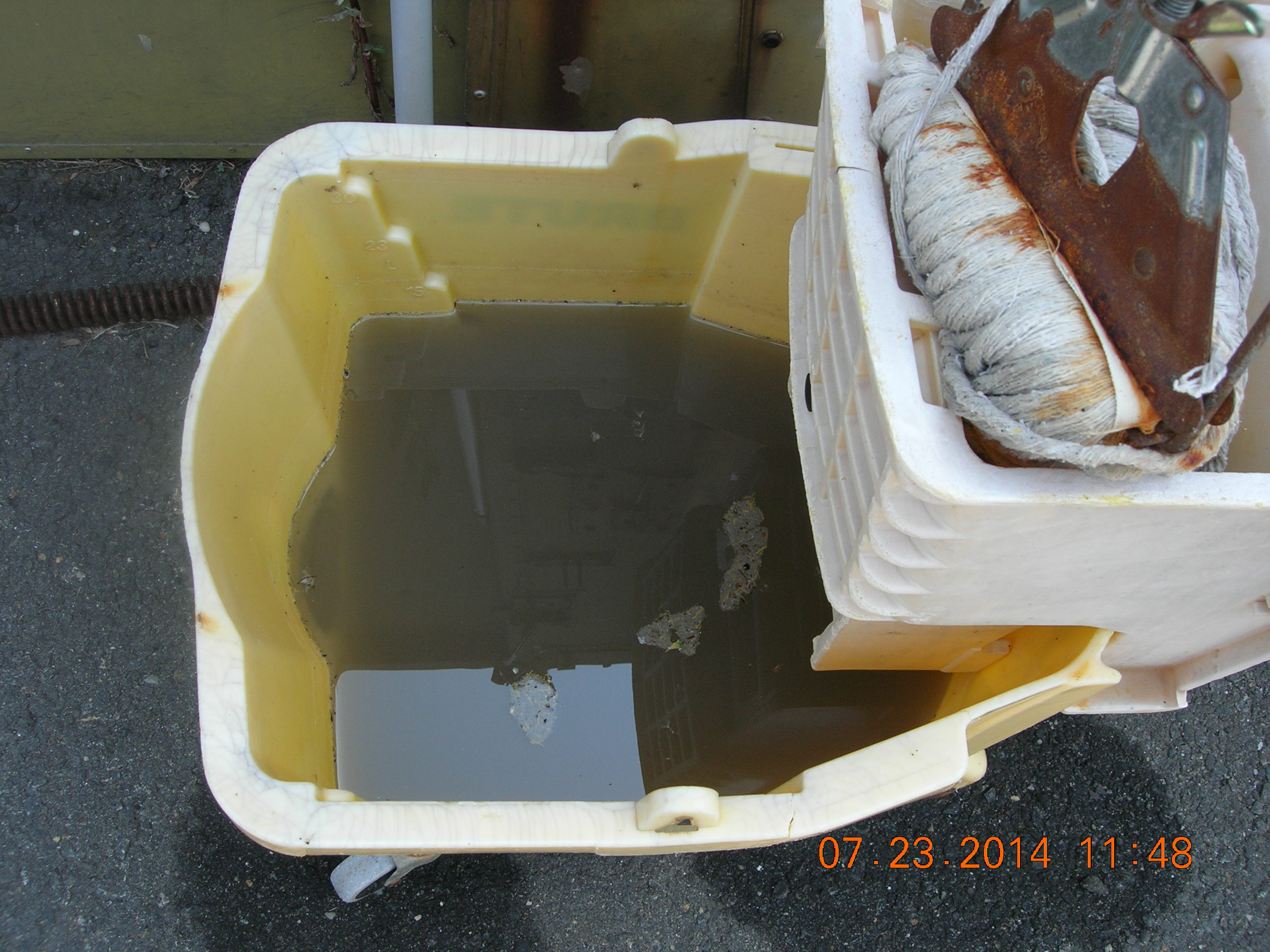 “There was a mop bucket and string mop attached to a severely rusted mop handle that was sitting outside in front of this green metal structure. This bucket was filled with dirty water and appeared to have not been used for some time and was creating a harborage for mosquitos and other water breeding insects.”
